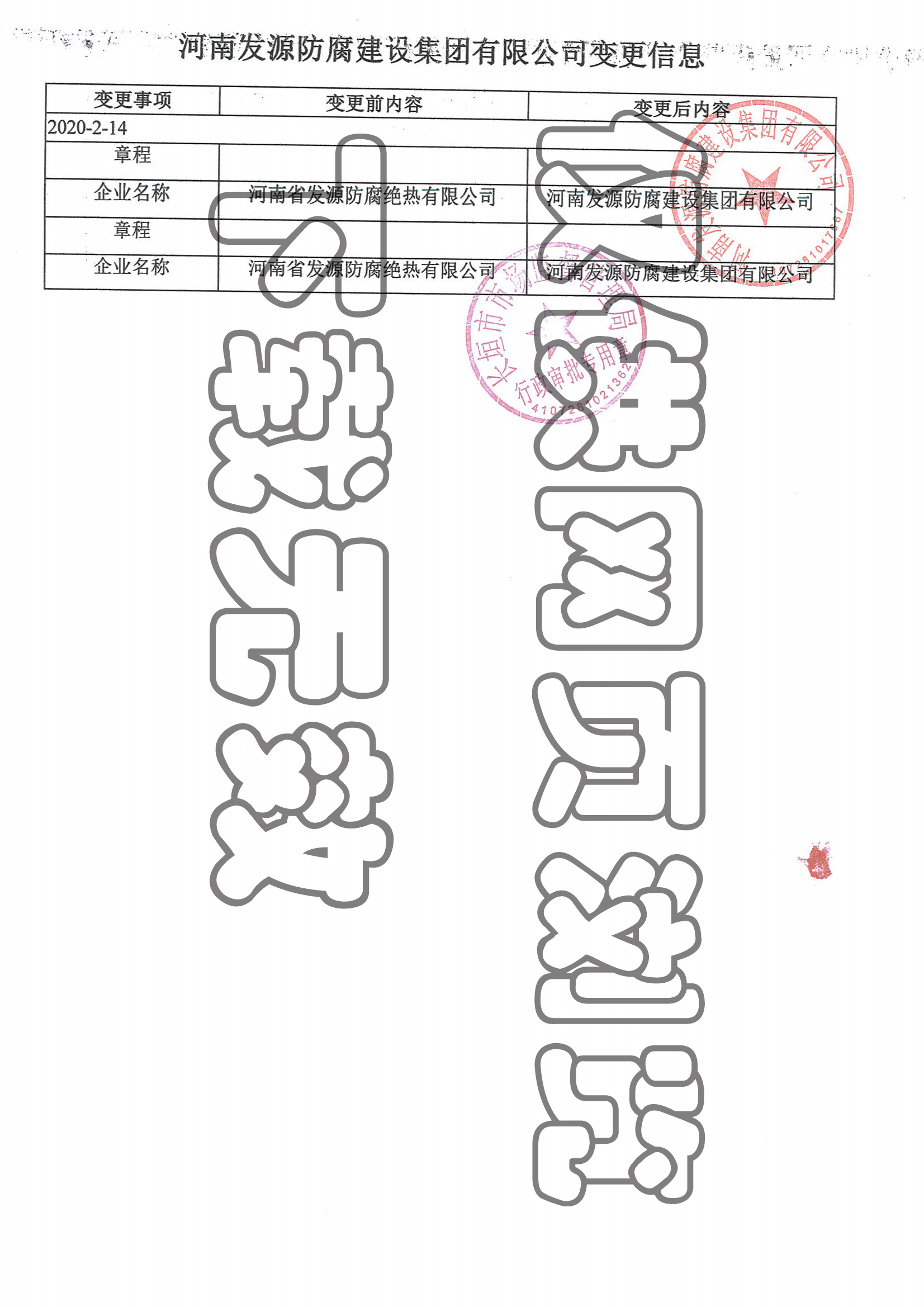 由于公司業務發展需要,從2020年2月14日起,將原公司“河南省發源防腐絕熱有限公司”變更登記為“河南發源防腐建設集團有限公司”。即日起,公司所有對內及對外文件、資料、開具發票、賬號、稅號等全部使用新公司名稱。公司更名后,業務主體和法律關系不變,原簽訂的合同繼續有效。謝謝合作。